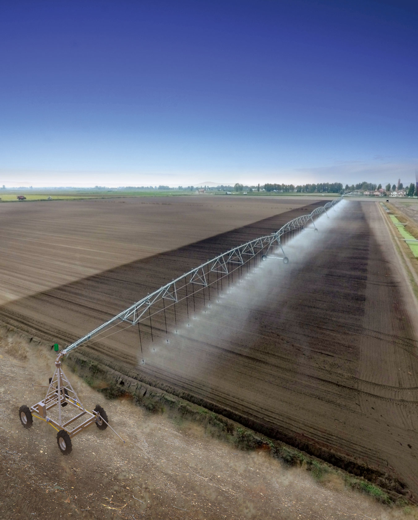 L’approvvigionamento di acqua è possibile con manichetta o da canale. Impiegato su poderi rettangolari, ad ala semovente con motrice centrale.